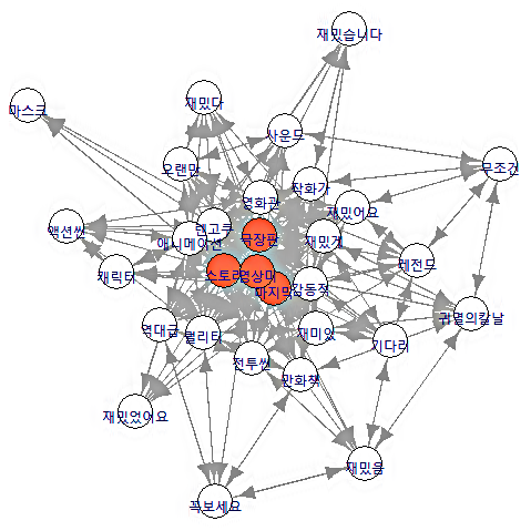 지난 포스팅에서 살펴본 바와 같습니다. igraph 를 이용하여 상위 빈도 30개 단어를 이용하여 네트워크 그래프를 구현한 그림은 아래와 같습니다.